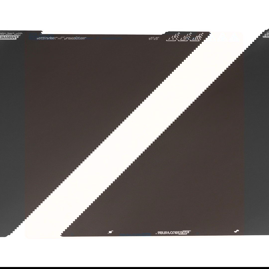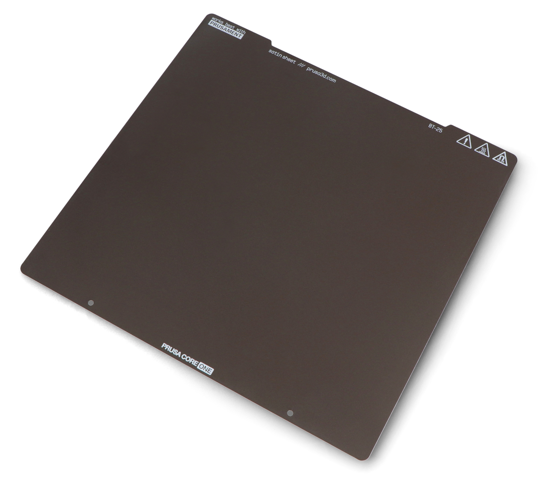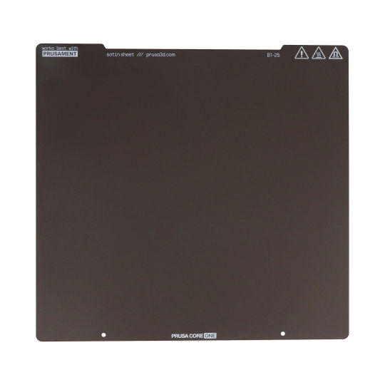 The satin sheet for Prusa CORE One printers is designed for stable, high-quality 3D printing. The powder-coated PEI coating creates a slightly textured surface that ensures excellent print adhesion and even model release after cooling. The sheet is compatible with a wide range of filaments: PLA, PETG, ABS, ASA, Flex 98A, polycarbonate (PC), and others . Polycarbonate prints better on it than smooth or textured sheets, although for frequent use , using a glue stick for additional surface protection is recommended . The satin coating also ensures a clean finish on the bottom layer of the print and hides minor scratches from use.