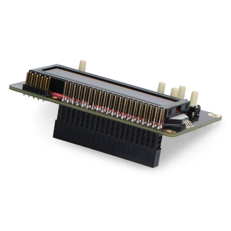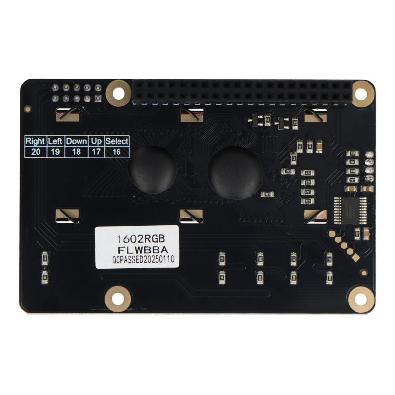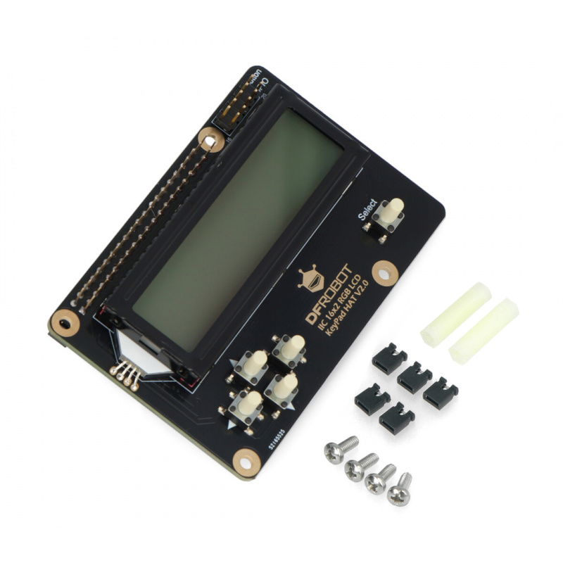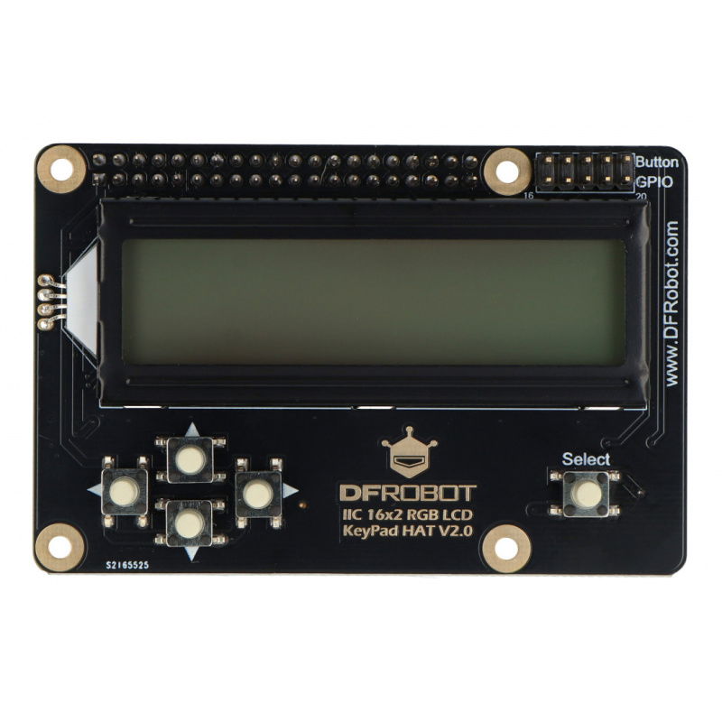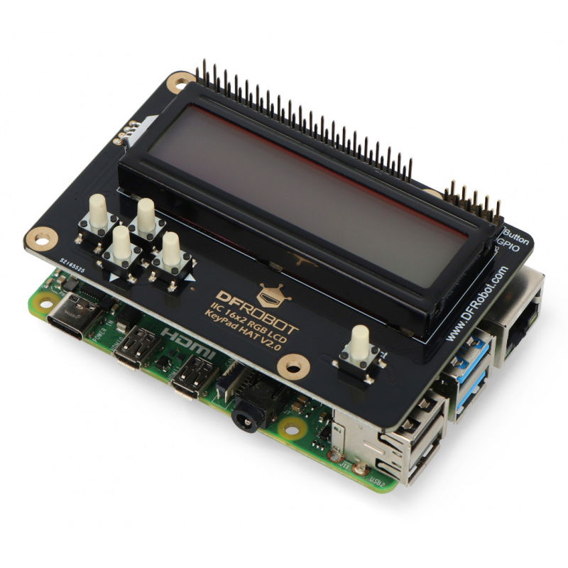 Overlay produced by DFRobot forRaspberry Pi 3B+and4Bin form ofLCD display. The screen displays characters in atwo-linelayout16x2. It presents subtitles in the following configuration:colored backgroundand black subtitles. It displays inRGBrange - 16 million colours. It also enables individual regulation of backlight brightness. On the front side of the overlay there are5functionalbuttonsto control Raspberry Pi. Thanks to them it is possible to switch display and additional configuration. The16x2 LCDdisplay is applicable when building a miniature data display monitor. It can also be used to create a small operating platform. The overlay usesI2Ccommunication interface.