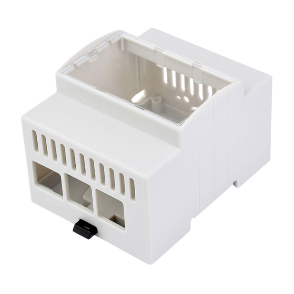 The Raspberry Pi 5 case is designed for industrial and installation applications requiring mounting on a standard DIN rail in a control cabinet. Made of durable ABS plastic using injection molding, it provides high mechanical resistance and an aesthetically pleasing appearance . An integrated handle allows for quick and stable mounting without the need for additional adapters. A transparent window in the top of the case allows viewing of the LEDs and monitoring of the Raspberry Pi 5's operation without removing the cover . The large interior space allows for the installation of additional HATs , expanding the functionality of the entire system. The design provides convenient access to connectors and simple board assembly using screws included on the bottom panel.