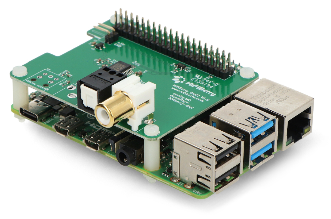 A hat-style shield for Raspberry Pi 4B, 3B+, 3B, 2B, A+, B, and Zero with a high-quality S/PDIF interface and optical connector. The chip used in the device has 24-bit resolution at 192 kHz.