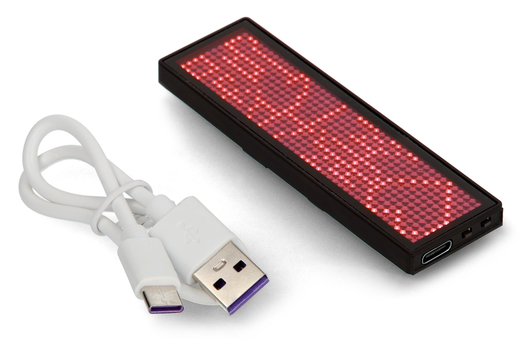 The LED Name Tag is an electronic name badge with a red LED display that dynamically displays a name, position, advertising slogan, or any other message. Thanks to its 11 x 44 LED matrix, the device offers clear and legible text even in well-lit rooms. The tag supports multiple display modes , such as scrolling in various directions, flashing, constant display, animation, and a light frame effect. The user can save up to 8 messages, each over 200 characters long . Configuration is performed via a micro USB cable from a computer or mobile app.
