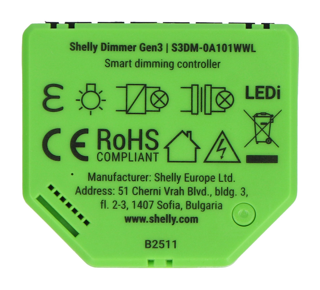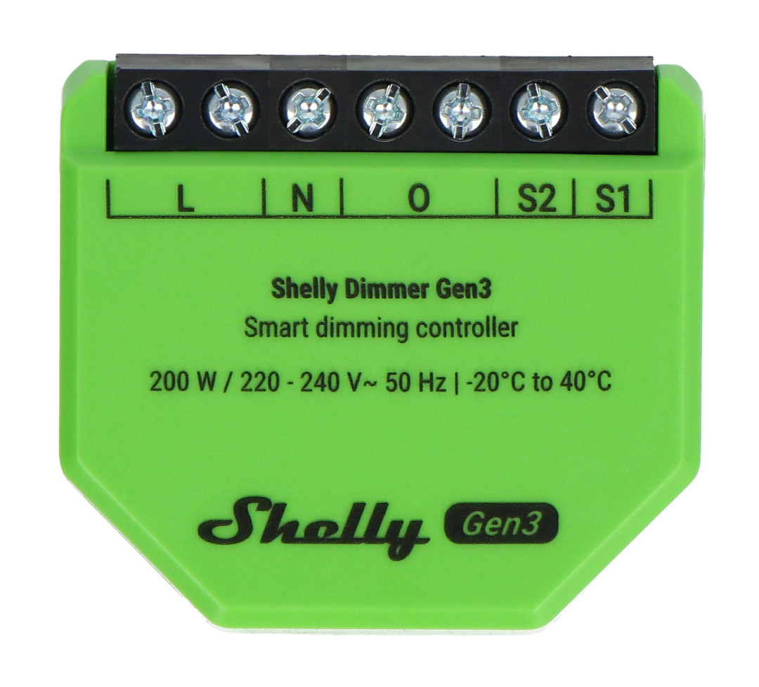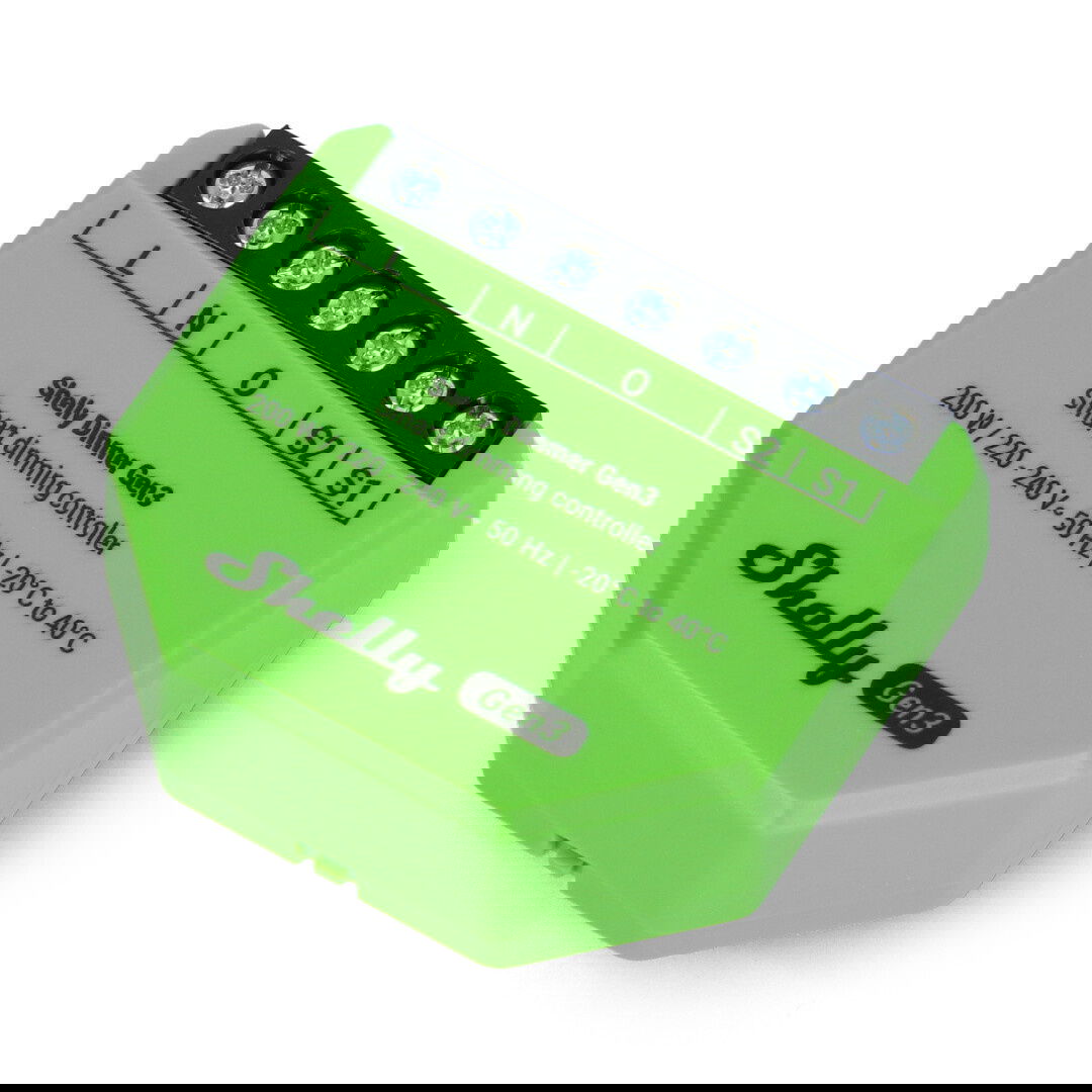 The Shelly Dimmer Gen3 is a single-channel controller that offers two ways to control lighting: locally (using traditional buttons ) and remotely (via Wi-Fi and Smart Home automation). The controller supports schedules, night mode, MQTT, scripts, and integration with Google Home, Alexa, and Home Assistant . It is equipped with a temperature sensor, a Wi-Fi repeater, and a BLE gateway , which also extends the range of other devices in the Shelly ecosystem. With a smooth transition and defined minimum/maximum brightness, users can precisely adjust lighting conditions. Support for up to 20 schedules and 20 webhooks, as well as the ability to trigger local scenes and scripts, makes it an exceptionally versatile home automation component. The Dimmer Gen3 does not require a neutral wire connection , making it ideal for retrofitting existing installations.