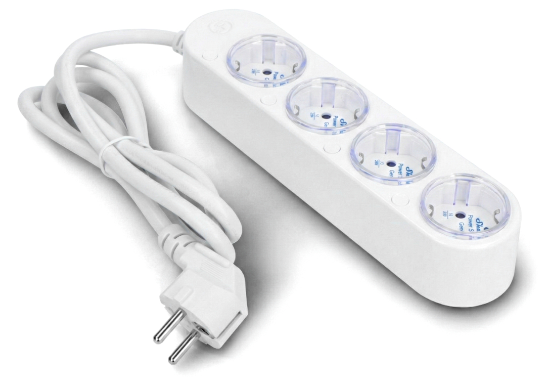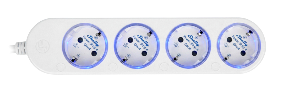 The Shelly Power Strip 4 Gen4 is a modern power strip , designed to combine the functionality of a classic outlet with the advanced automation of smart sockets . Four individual sockets are equipped with real-time energy measurement , allowing for precise management of connected devices and optimizing power consumption. The Shelly Power Strip 4 Gen4 offers wireless WiFi , Bluetooth, and ZigBee connectivity, as well as support for the Matter standard. It supports devices up to 3680W (16A total for four sockets and 12A per single socket) and integrates with smart home systems such as Apple HomeKit, Google Home, and Amazon Alexa . Multicolor LED backlighting informs about the status and activity of the sockets, while night mode allows not only for adjusting the brightness level but also for using the strip as an additional, subtle light source. All this to ensure high user comfort and a good night's rest.