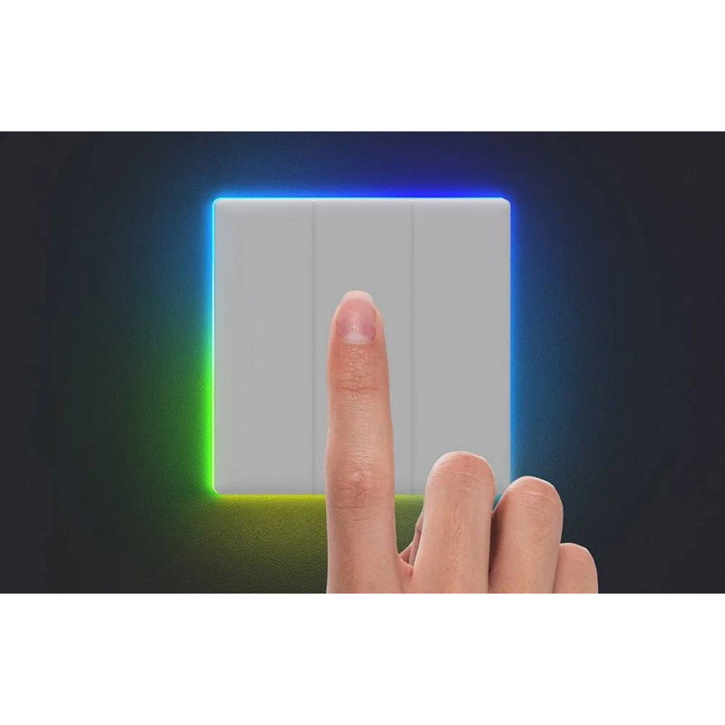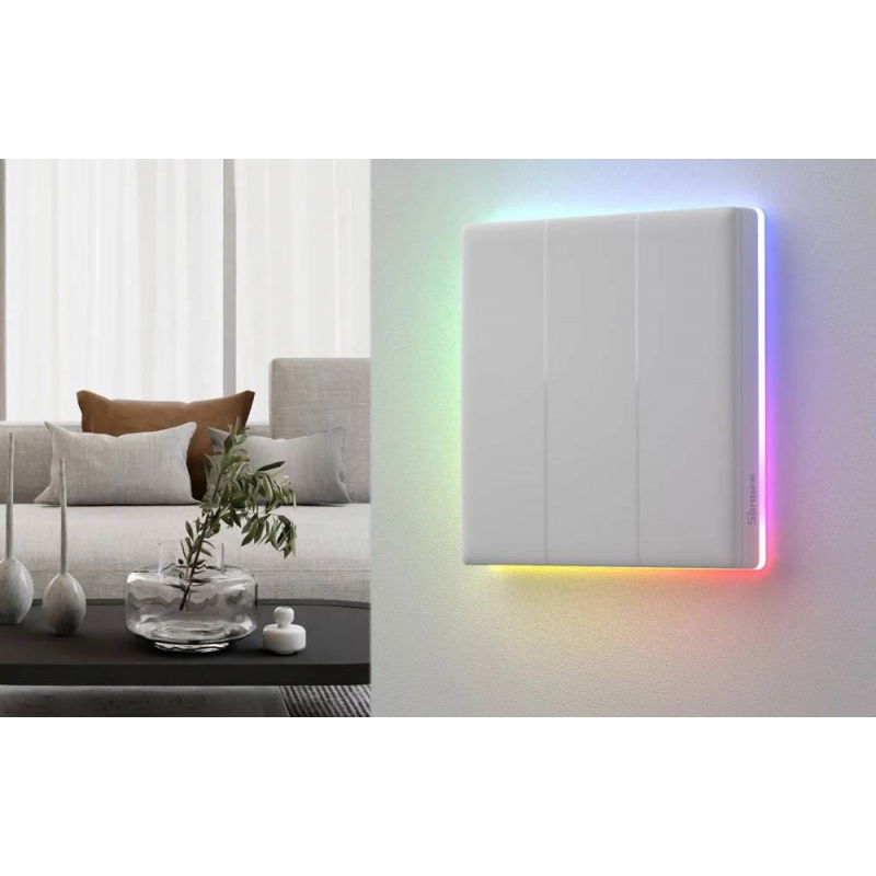 The switch features a large touch panel with three buttons that covers almost the entire front surface. This makes operation intuitive and convenient – a light touch is enough to turn the light on or off. The edges of the panel are surrounded by intelligent LED lighting , which indicates the device's status and can also serve as decorative lighting. There are eight different lighting modes to choose from, including Night Light, Party, and Color. Built-in lighting effects allow you to adjust the room's ambiance to the current situation. Additionally, touching the panel triggers a subtle backlight, an audible signal, and a subtle vibration , confirming that the command has been executed even in a dark room.