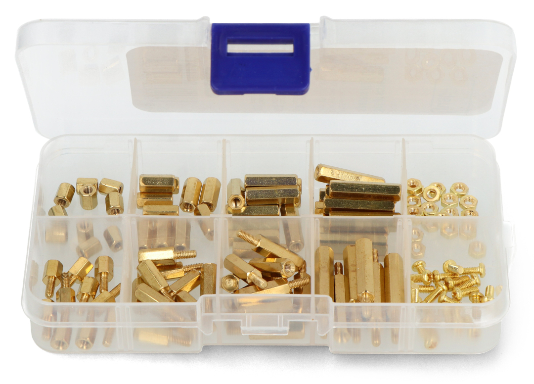 The set includes M2.5 screws, nuts , and spacers of various lengths. The set is ideal for mounting printed circuit boards and electronic components, ensuring aesthetic and stable mounting. The entire set is housed in a practical organizer that facilitates storage and quick access to necessary components.