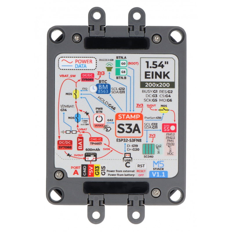 Air Quality is an advanced air quality monitoring device combining high measurement precision with energy efficiency. Equipped with SEN55 and SCD40 sensors, it monitors particulate matter (PM1, PM2.5, PM4, PM10), temperature, humidity, VOCs, and CO2 levels. The built-in StampS3 development module (ESP32S3) ensures seamless data processing and storage. It features a 1.54" e-ink display , a 450mAh battery, and a real-time clock (RTC) power management system, ensuring long operating times. Air Quality is easy to install and comes pre- configured to sync with the EZDATA cloud , allowing remote access to measurement results.