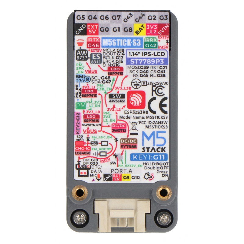 The M5StickS3 from M5Stack is a development module designed for IoT projects, embedded systems, and education. It's based on the powerful ESP32-S3-PICO-1 chip, which provides Wi-Fi connectivity and high processing performance. It features an integrated 1.14-inch LCD display , microphone, IMU sensor (BMI270), LED , and ES8311 audio chip . Its compact form factor and built-in 250 mAh battery make it ideal for mobile applications as well as integration into larger systems. It supports HAT and Unit extensions , significantly expanding its functionality.