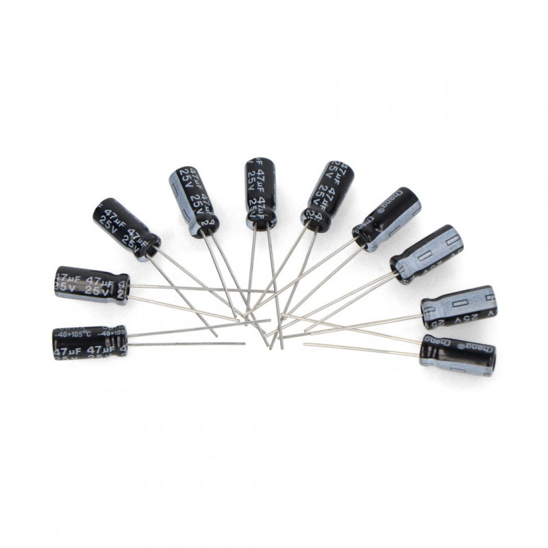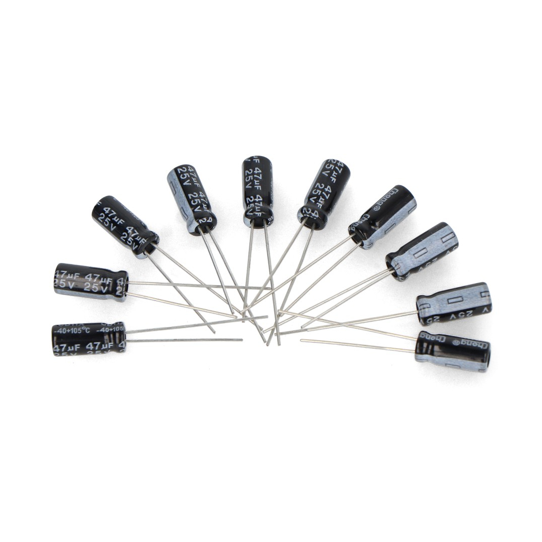 Product description: Electrolytic capacitor 47uF/25V 5x11mm 105C THT - 10pcs