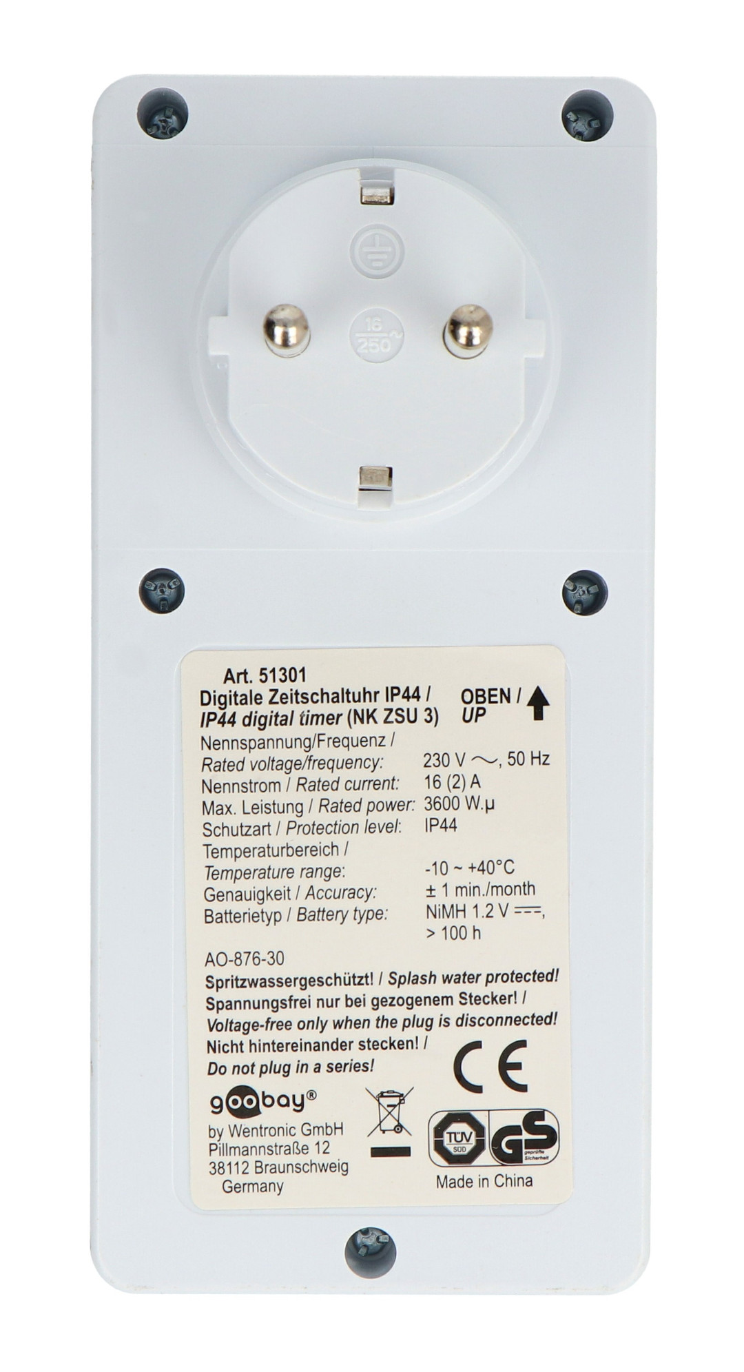 Product description: Digital timer 230V 3600W IP44 - Goobay 51301