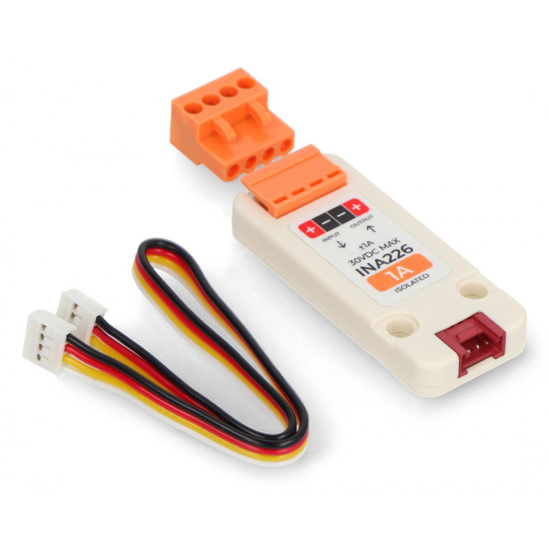 The M5Stack INA226-1A measurement module is an advanced voltage, current, and power monitoring device integrated with a high-precision 16-bit ADC. It supports voltages up to 30 V DC and currents in the ±1 A range, enabling the measurement of both positive and negative values. Thanks to the I2C interface and address 0x41, the module works with popular platforms such as Arduino and UiFlow2. Built-in galvanic isolation of signals and power ensures safe separation of the measurement path from the main control system, increasing interference immunity and safety. An automatic self-resetting fuse protects the device against overloads for added protection. Its compact design and integration-ready design make it ideal for industrial and educational applications.