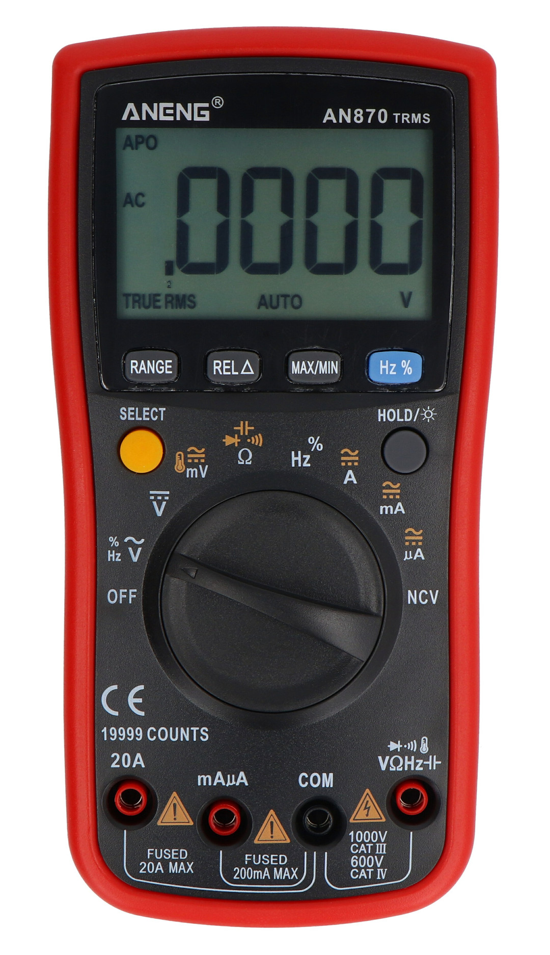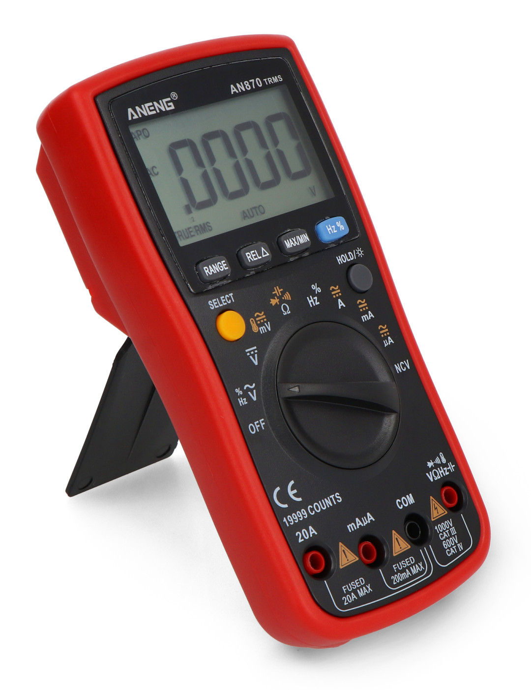AN870 Pro is an advanced multimeter that combines functionality and handiness. Thanks to TrueRMS, it guarantees accurate measurement of alternating voltage , and the maximum reading of 19999 units ensures precision measurements even in professional applications. Equipped with a backlit display, HOLD, MAX / MIN, REL (relative measurement) and Auto Power Off functions with the possibility of switching off - it is ready to work in all conditions. Solid housing with a support function and an external thermocouple increase the ergonomics and usability of the meter. It is powered by two AA batteries .