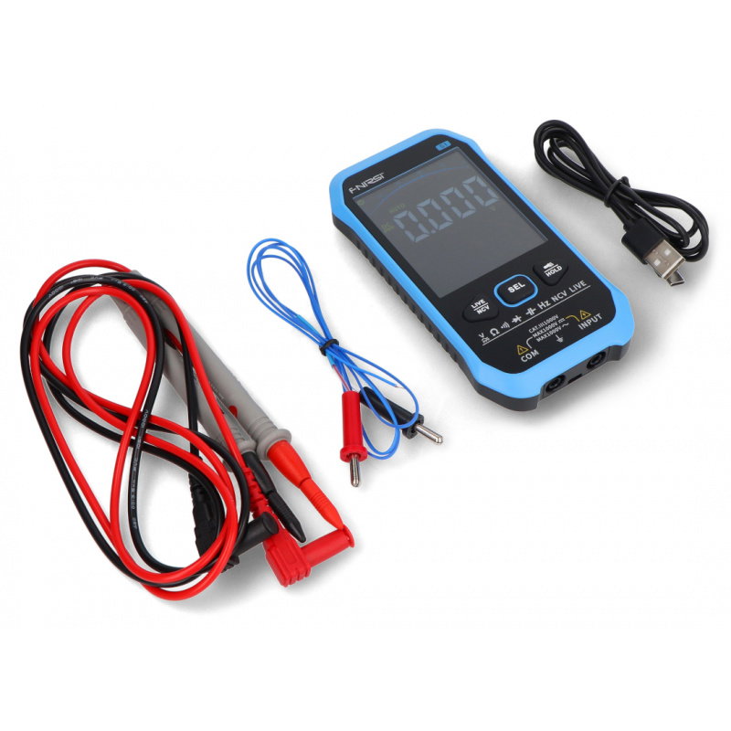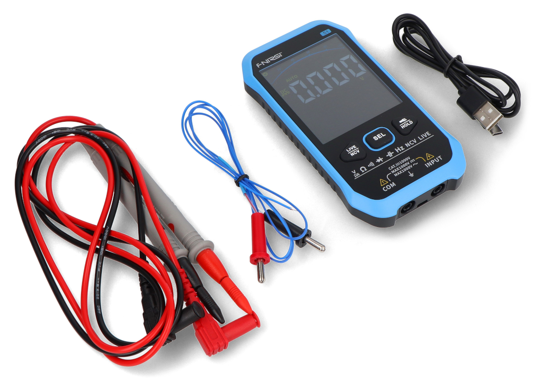 The FNIRSI S1 digital multimeter is designed for quick and safe diagnostics of electrical installations and electronics. The device measures AC and DC voltage, resistance, frequency, and temperature , and also provides a continuity test with an audible signal . True RMS technology ensures reliable results even with irregular waveforms, which is important when working with switched-mode power supplies and controllers. The built-in NCV function with visual and audible indication allows voltage detection without contact with the conductor, while the phase and neutral conductor testing mode facilitates basic installation tests. The multimeter is powered by a 1000 mAh battery charged via USB Type-C , has an auto-off function, and a flashlight , which is useful for measurements in dimly lit areas.