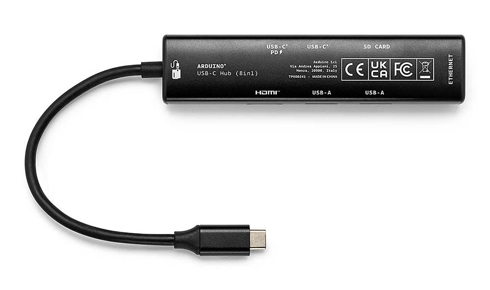 The Arduino USB-C Hub 8-in-1 is designed to maximize the capabilities of Arduino boards and other devices with a USB Type-C port. Integrating HDMI, Ethernet, USB , and memory card readers allows you to create a fully functional work environment. The hub supports 4K resolution at 30 Hz , fast data transfer rates of up to 5 Gbps , and Power Delivery of up to 65 W. Its plug-and-play design and full compatibility with Windows, macOS, and Linux systems ensures immediate readiness without the need for driver installation. The slim, black housing, weighing just 60 g, makes the hub incredibly portable, and the integrated 175 mm cable allows for convenient placement on your workstation.