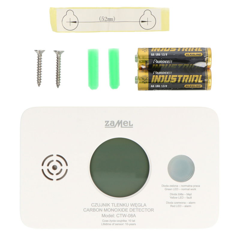 The CTW-08A carbon monoxide sensor from Zamel is an essential protection against carbon monoxide. The modern electrochemical sensor detects even low concentrations of carbon monoxide, and the results are displayed on a clear LCD screen . The device informs the user not only about the CO concentration , but also about the battery status, alerting when it is discharged. Additionally, the sensor is equipped with optical and audible signaling - a 90 dB alarm warns household members in a dangerous situation. The sensor is powered by two AA batteries , which ensures independence from the electrical network and freedom in choosing the installation location, for example in the boiler room, bathroom or kitchen .