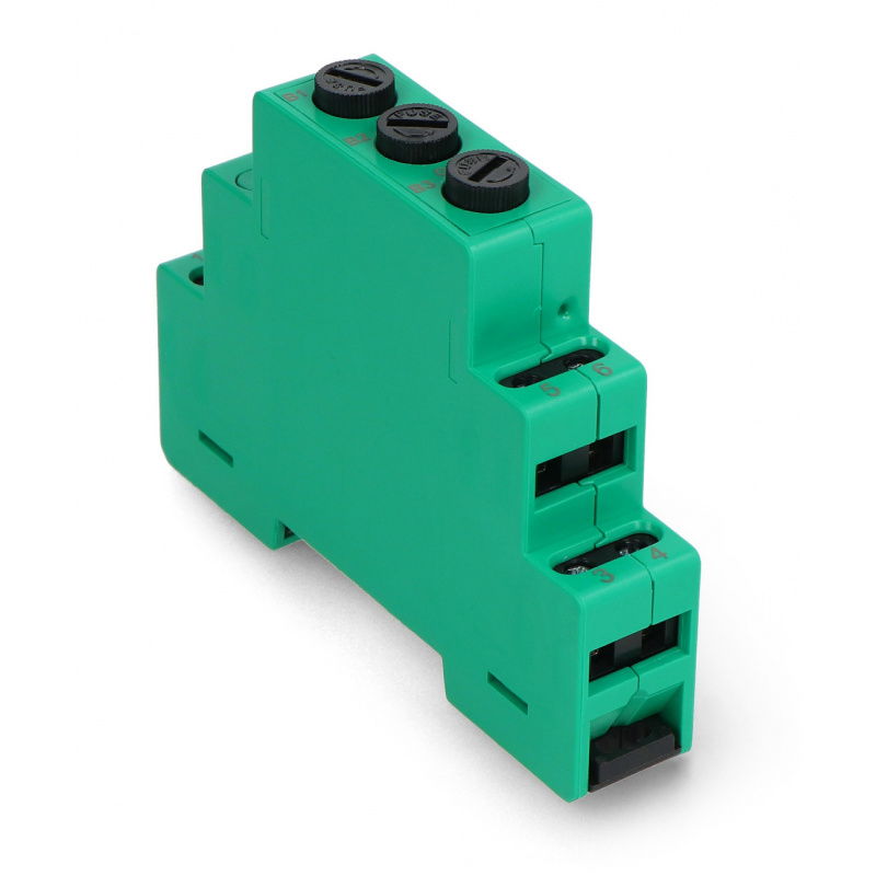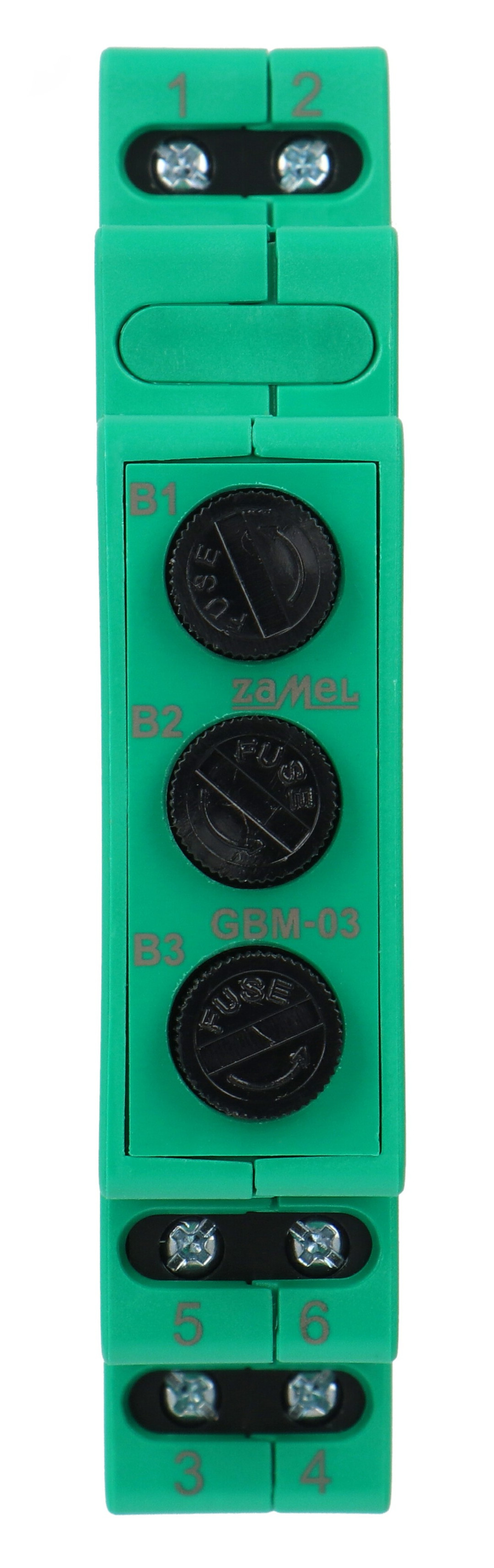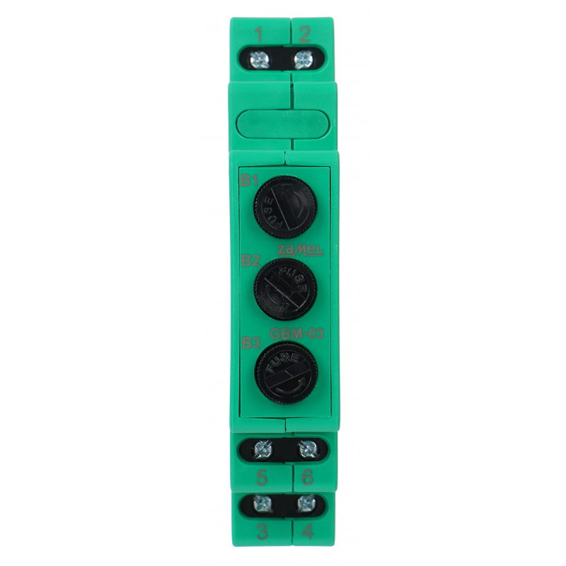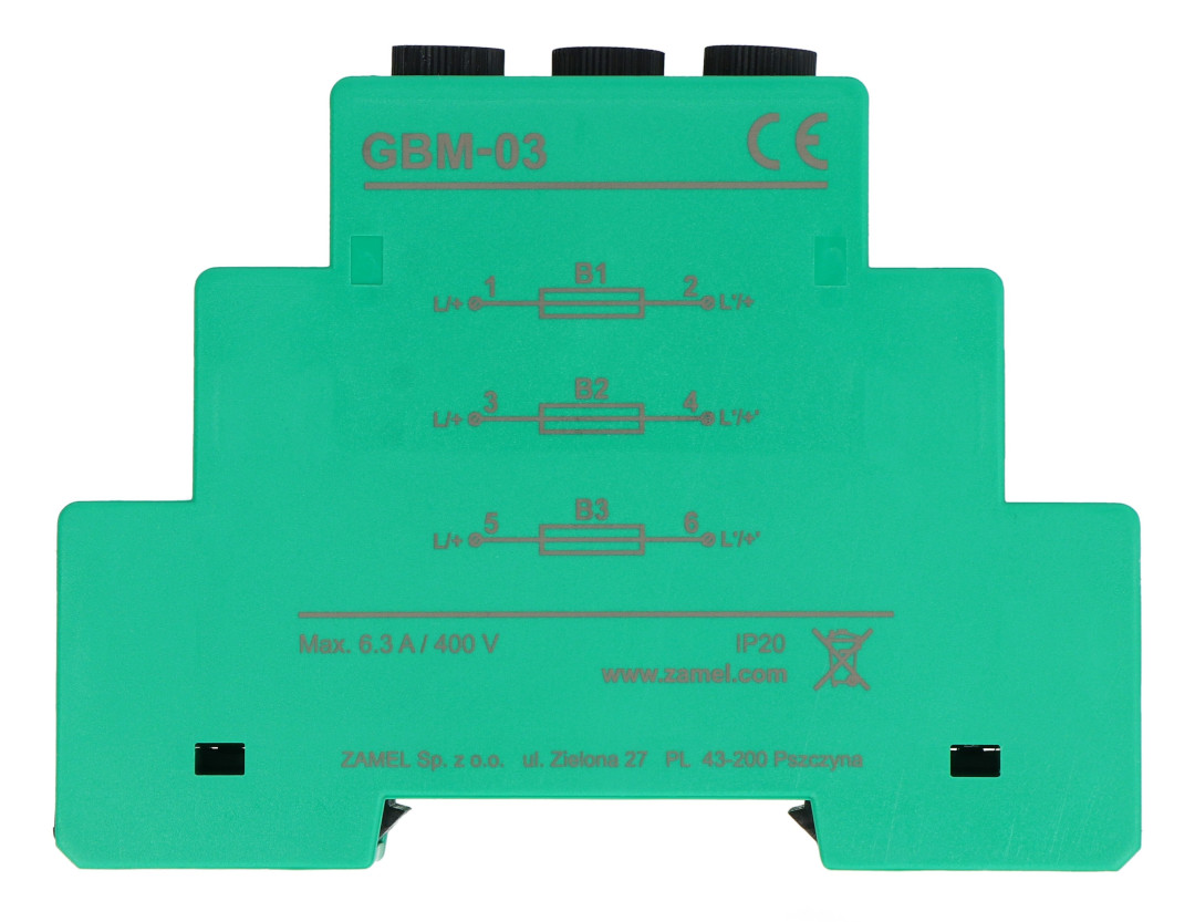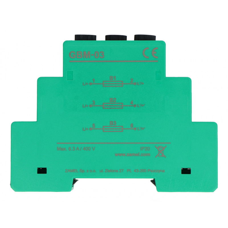 The Zamel Supla GBM-03 is a fuse module designed to protect electrical circuits against current surges above the allowable limit. Its design allows for protection of three independent phases in a single, compact, DIN rail-mounted (TH35) enclosure, saving space in the switchboard. The module is equipped with three 500 mA fuses , replaceable with fuse links rated up to 6.3 A. A visible break in the circuit after a fuse has been removed or blown ensures quick recognition of the protection status.