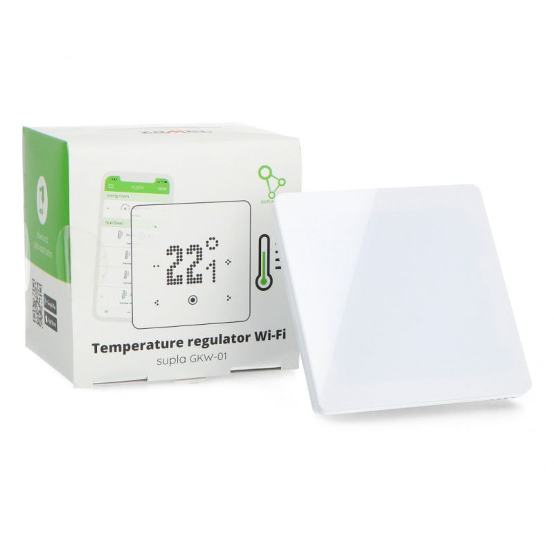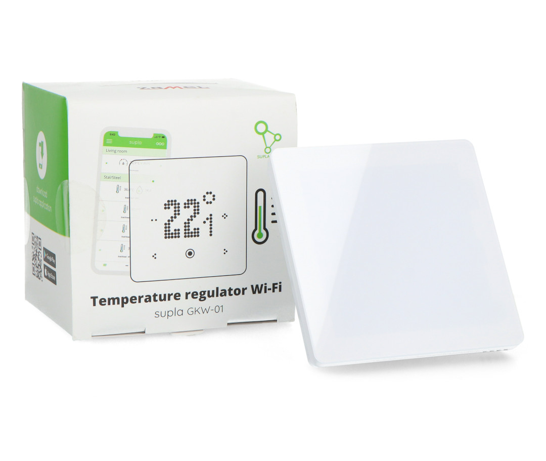 The GKW-01 from Zamel Supla is a modern temperature controller that allows you to easily control room temperature and heating systems such as underfloor heating or electric heaters. Connecting via Wi-Fi to the Supla app allows you to remotely set the temperature and program it based on a weekly schedule. The LED matrix display offers automatic brightness adjustment based on room lighting. A built-in relay with a load of up to 16A allows you to control electric heaters and valves. The GKW-01 also offers the ability to connect external sensors , such as a window opening sensor or an NTC temperature sensor.