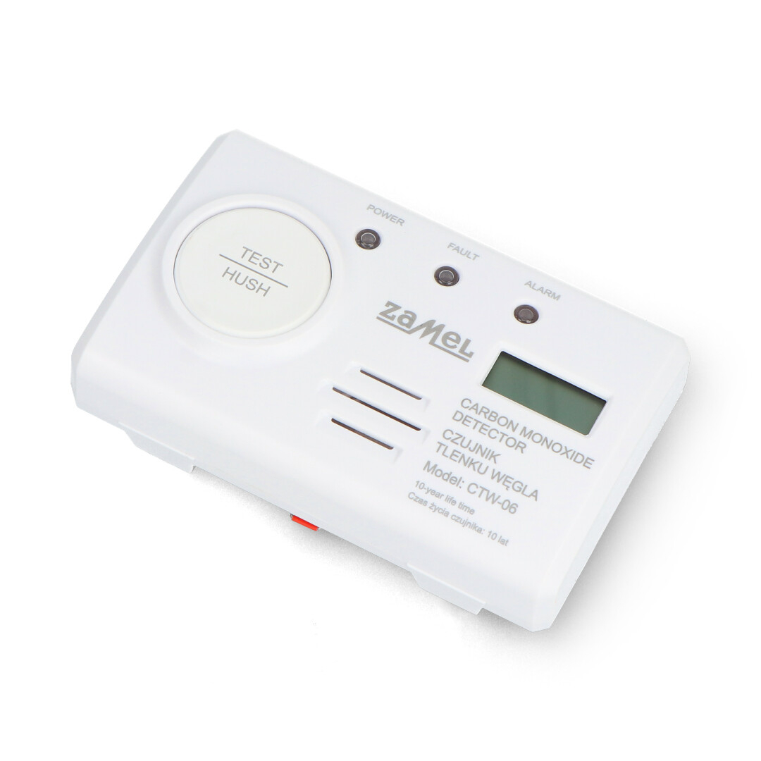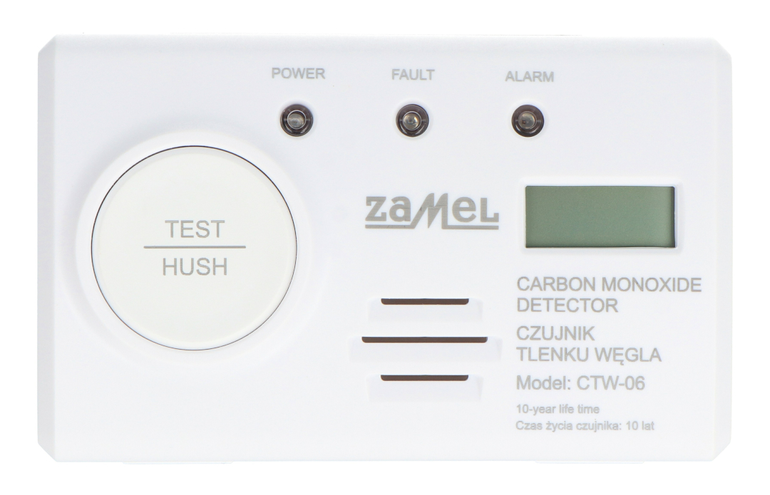 The Zamel CTW-06 carbon monoxide detector is designed for use in rooms where appliances burning fuels such as gas, wood, coal, or heating oil may be used. It is suitable for apartments, single-family homes, boiler rooms, rooms with gas heaters, fireplaces, water heaters, and fuel stoves . Powered by a built-in battery and capable of wall or free-standing mounting, the detector can be easily adapted to the room's layout. Installing the detector in bedrooms, living rooms, and hallways significantly increases user safety by enabling early detection of dangerous carbon monoxide concentrations.