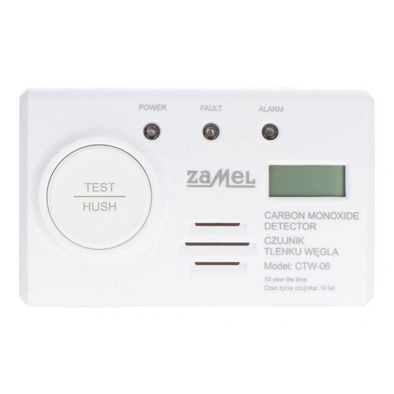 The Zamel CTW-06 carbon monoxide detector is designed for use in rooms where appliances burning fuels such as gas, wood, coal, or heating oil may be used. It is suitable for apartments, single-family homes, boiler rooms, rooms with gas heaters, fireplaces, water heaters, and fuel stoves . Powered by a built-in battery and capable of wall or free-standing mounting, the detector can be easily adapted to the room's layout. Installing the detector in bedrooms, living rooms, and hallways significantly increases user safety by enabling early detection of dangerous carbon monoxide concentrations.