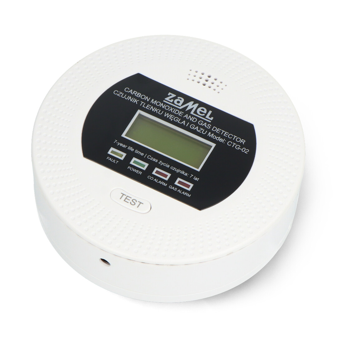 The Zamel CTG-02 Carbon Monoxide and Gas Detector is a practical device that combines the detection of carbon monoxide and flammable gases such as natural gas and propane-butane . Using an electrochemical and semiconductor sensor , it responds to dangerous gas concentrations by triggering a 90 dB audible alarm and visual indication . The built-in LCD display indicates the type of gas detected and the current concentration level. The basic mains power supply from the included power supply is supplemented by an emergency battery backup , ensuring the sensor remains functional even after a power outage. A self-diagnostic system signals sensor damage and the end of its lifespan, and each unit is tested in a specialized chamber and certified to correctly detect carbon monoxide concentrations of 300 ppm in under 3 minutes.