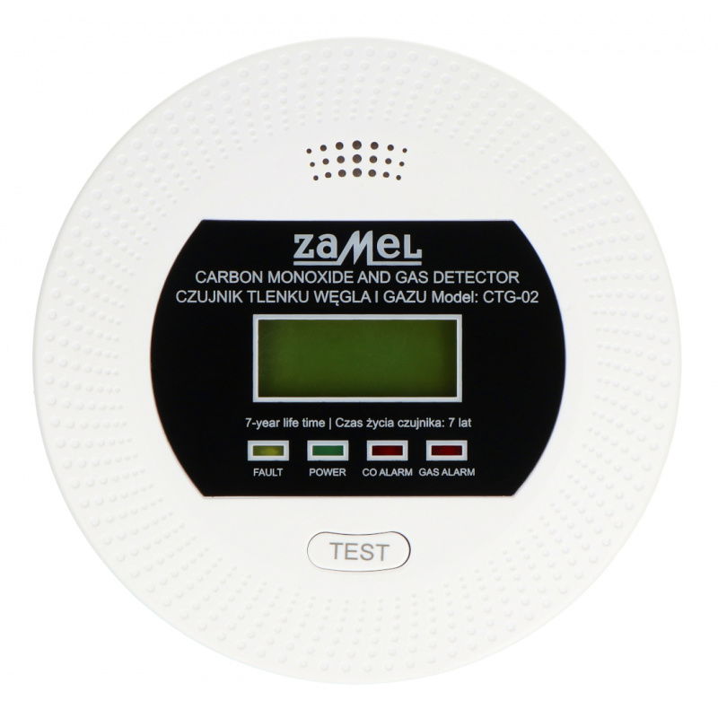 The Zamel CTG-02 Carbon Monoxide and Gas Detector is a practical device that combines the detection of carbon monoxide and flammable gases such as natural gas and propane-butane . Using an electrochemical and semiconductor sensor , it responds to dangerous gas concentrations by triggering a 90 dB audible alarm and visual indication . The built-in LCD display indicates the type of gas detected and the current concentration level. The basic mains power supply from the included power supply is supplemented by an emergency battery backup , ensuring the sensor remains functional even after a power outage. A self-diagnostic system signals sensor damage and the end of its lifespan, and each unit is tested in a specialized chamber and certified to correctly detect carbon monoxide concentrations of 300 ppm in under 3 minutes.